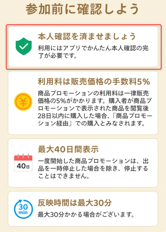 プロモーション機能など、本人確認をして初めて利用できる機能もあるので、手続きを行う価値は十分にあると言えます。