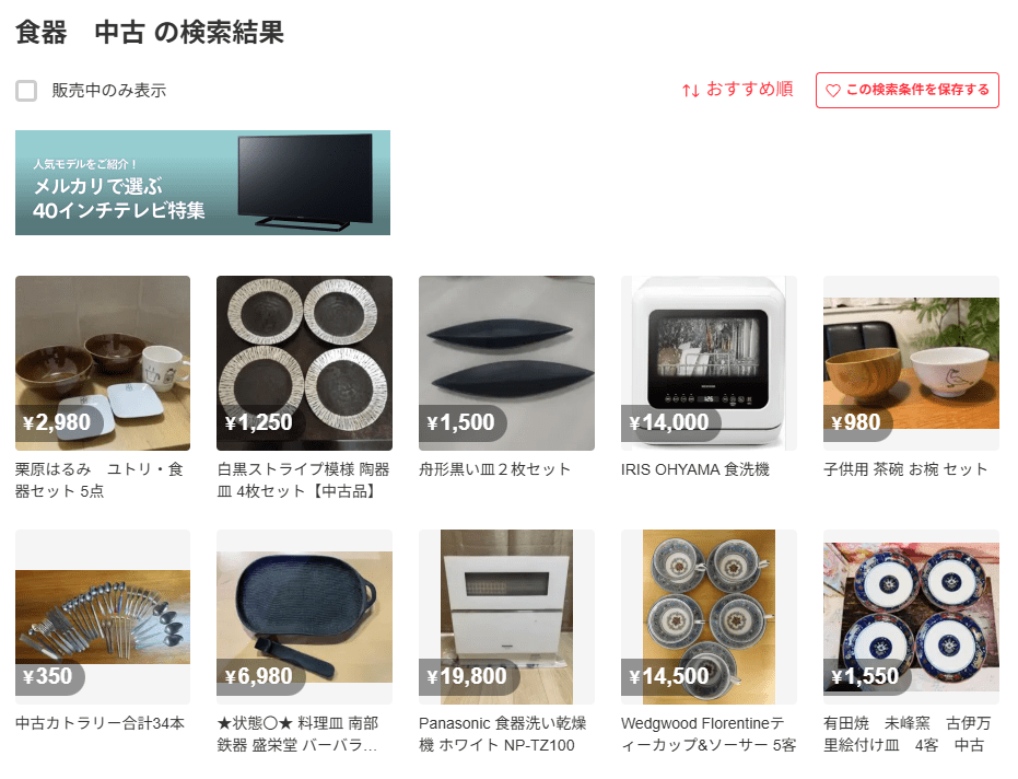 下記の画像はメルカリで「食器 中古」と検索した結果。