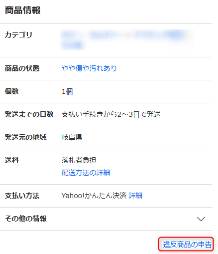 ガイドライン違反と思われる商品を発見した場合は、商品ページからYahoo! JAPANに申告できます。